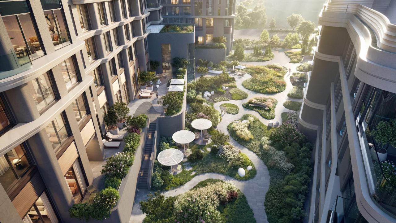 Закрытый двор без машин обеспечен круглосуточной охраной и системами контроля доступа. Двор создан как ландшафтное продолжение окружающих природных парков и зонирован для различных видов отдыха, детских игр, занятий спортом.